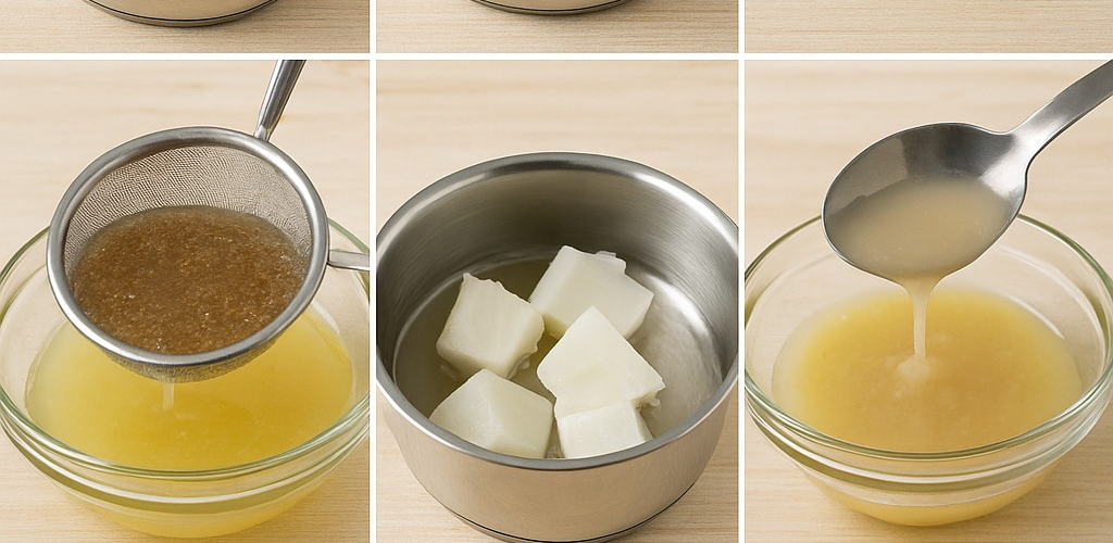 - Nad parou rozpusťte jemné mýdlo či glycerin, nechte lehce vychladnout a přilijte k směsi.