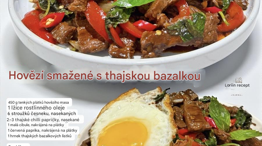 Rychlé a chutné thajské hovězí s bazalkou. Pikantní, aromatické a ideální podávat s rýží nebo nudlemi. Snadný recept krok za krokem pro domácí kuchyni.